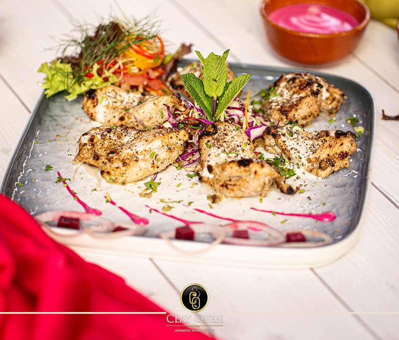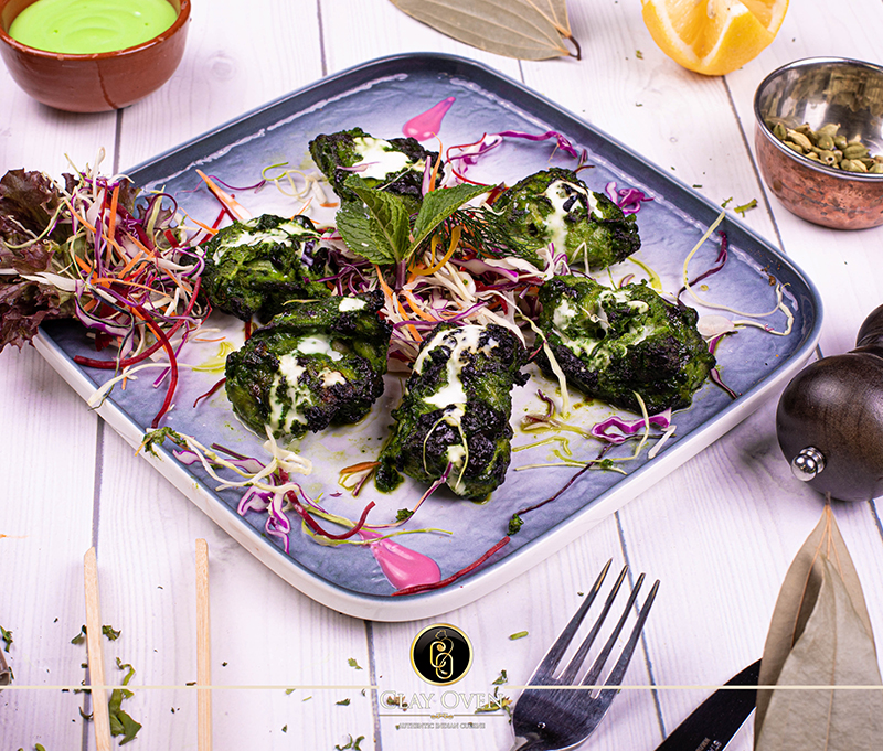 Tender chicken pieces marinated in a vibrant green paste of coriander, mint, Spinach, Indian spices and Herbs, then grilled to perfection on charcoal. Served with Mint sauce and Yogurt.