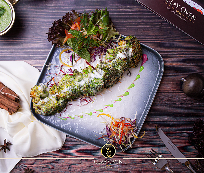 A tandoori appetizer where fresh broccoli is coated with fresh cream mixed with Indian herbs and grilled on Charcoal, served with fresh Mint Sauce.