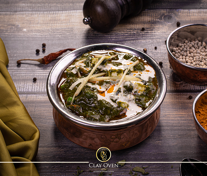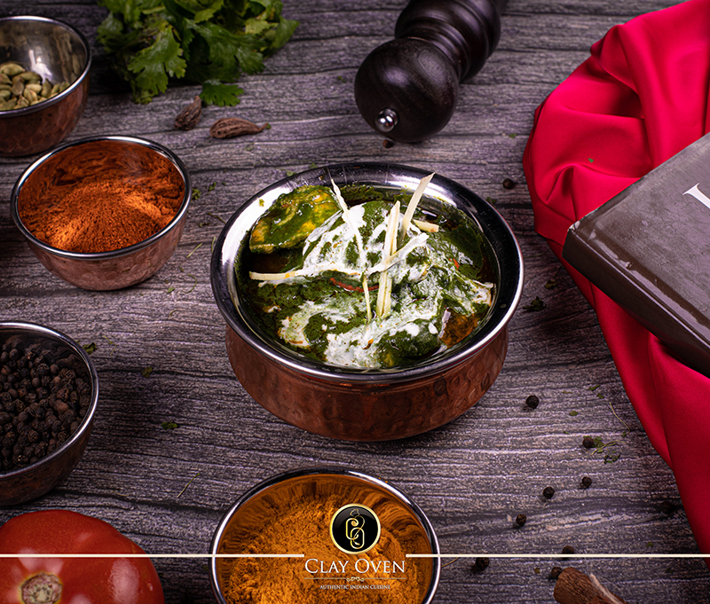 Chicken pieces cooked in fresh spinach gravy, seasoned with aromatic whole spices and Indian herbs. A nutritious and flavorful main course blending tender meat with spinach.