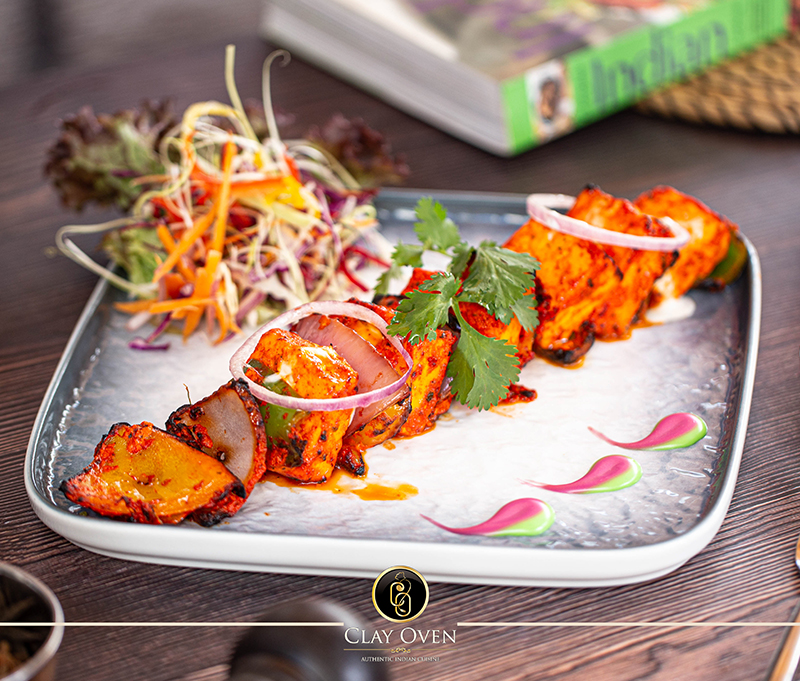 Fromage indien mariné avec des herbes indiennes, du yaourt, de la crème et farci de noix de cajou et de fromage. Grillé lentement au four à charbon avec des tranches d'oignon, de tomate et de poivron, servi avec une sauce à la menthe.