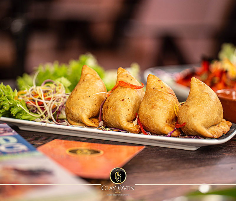Une entrée Indienne populaire et délicieuse composée de petit pois et de pommes de terre farcis avec des épices dans une pâte de farine de blé, puis frits dans l'huile jusqu'à ce qu'ils soient dorés, servis avec une sauce au tamarin.