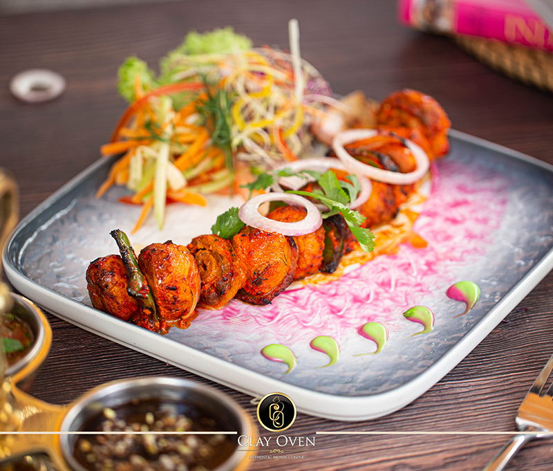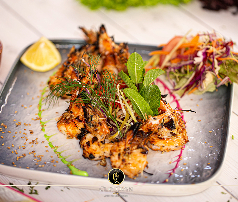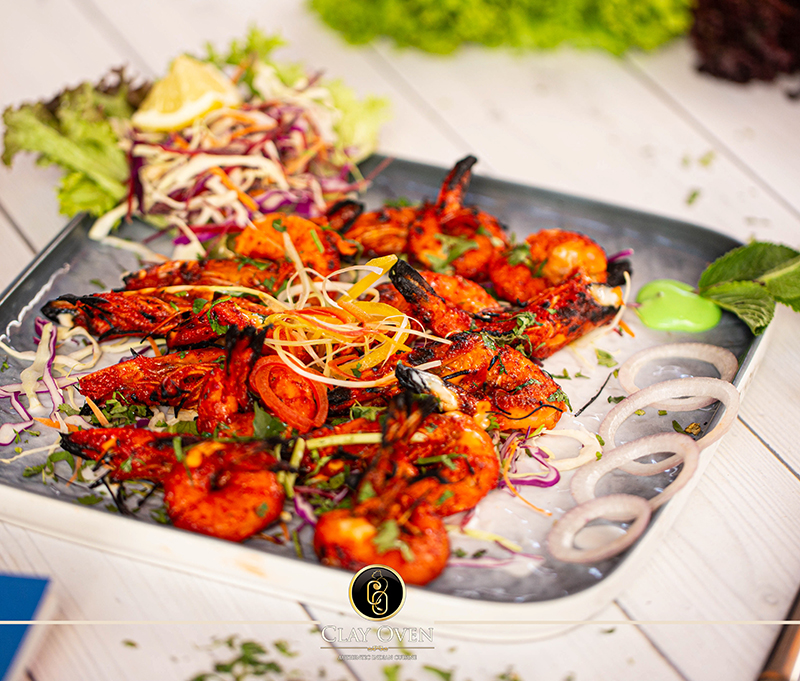 Succulent prawn appetizer with a smoky flavour of Charcoal, perfectly marinated in homemade tandoori Masala, Spices and Grilled in Tandoor. Served with Mint and Coriander Sauce topped with special Masala. Succulent apéritif de crevettes au goût fumé de charbon de bois, parfaitement mariné dans du tandoori masala maison, des épices et grillé au tandoor. Servi avec une sauce à la menthe et à la coriandre garnie d’entrée Masala.