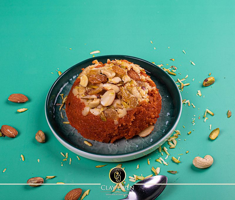 A delightful Indian dessert made from grated carrots cooked in milk, ghee, and sugar, infused with cardamom and garnished with nuts.