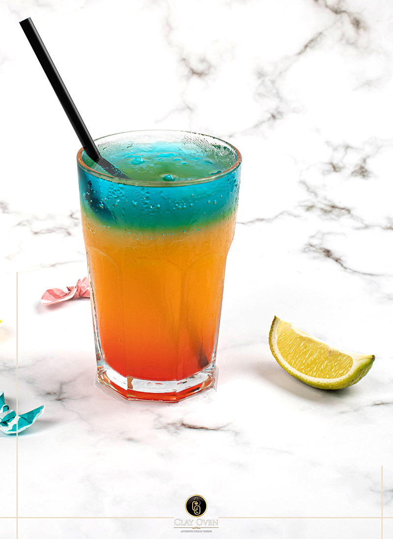 A vibrant drink layering Blue Curacao, pomegranate syrup and refreshing orange juice, creating a colorful and flavorful experience.