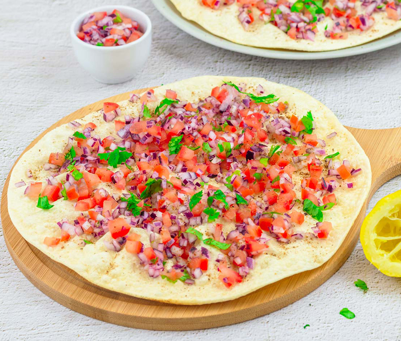 Papad croustillant grillé garni d'un mélange savoureux d'oignons hachés, de tomates et de coriandre fraîche, assaisonné d'épices indiennes.