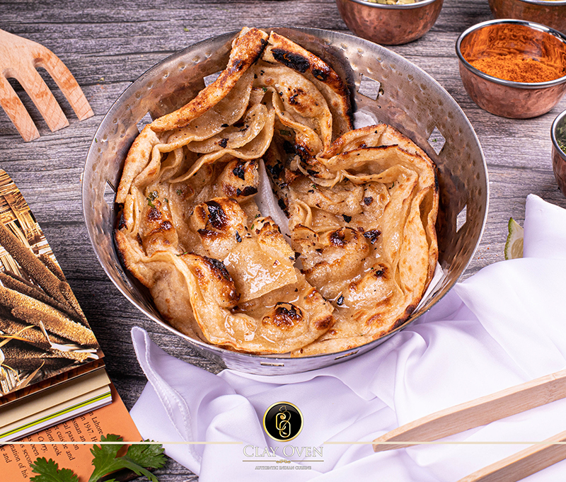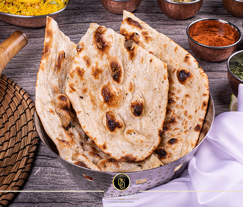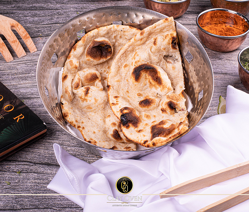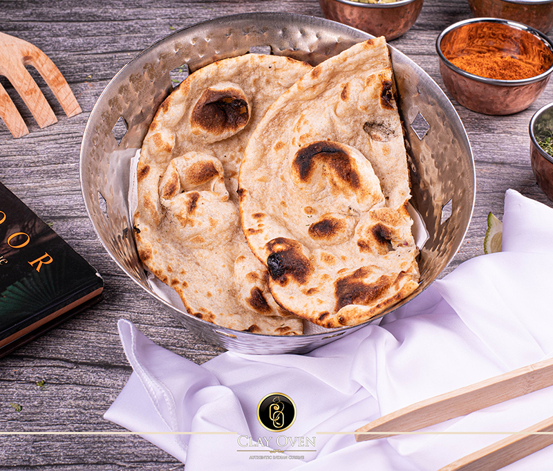 Traditional whole wheat flatbread cooked in a tandoor oven and generously brushed with melted butter. Pain traditionnel à base de farine de blé entier, cuit dans un four tandoor et généreusement badigeonné de beurre.