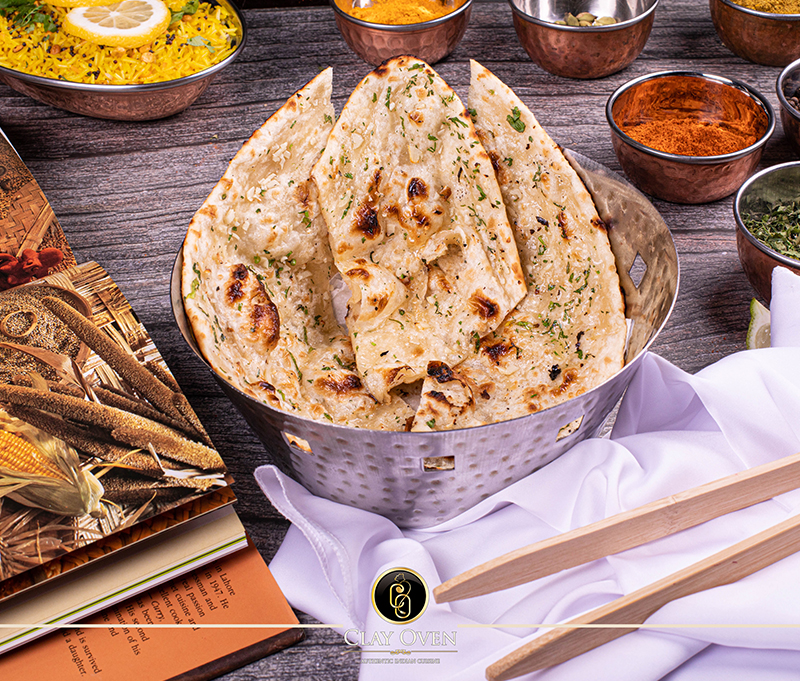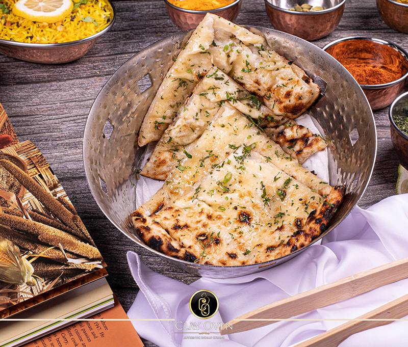 Garlic Naan- Soft, fluffy Indian flatbread made from fine Wheat flour, infused with fresh garlic and cooked to perfection in a traditional tandoor oven. Pain Indien moelleux et léger à base de farine de blé tendre, infusé d'ail frais et cuit à la perfection dans un four tandoor traditionnel.