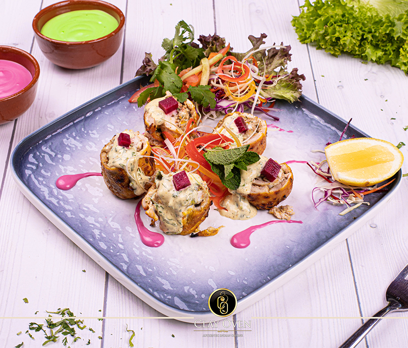 Une combinaison de pommes de terre farcies d'un délicieux paneer mélangé à des Noix et des herbes. Grillé au charbon de bois Tandoor jusqu'à ce qu'il soit doré, servi avec une sauce à la menthe.