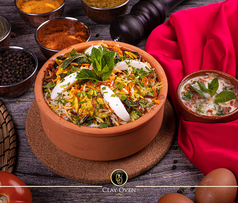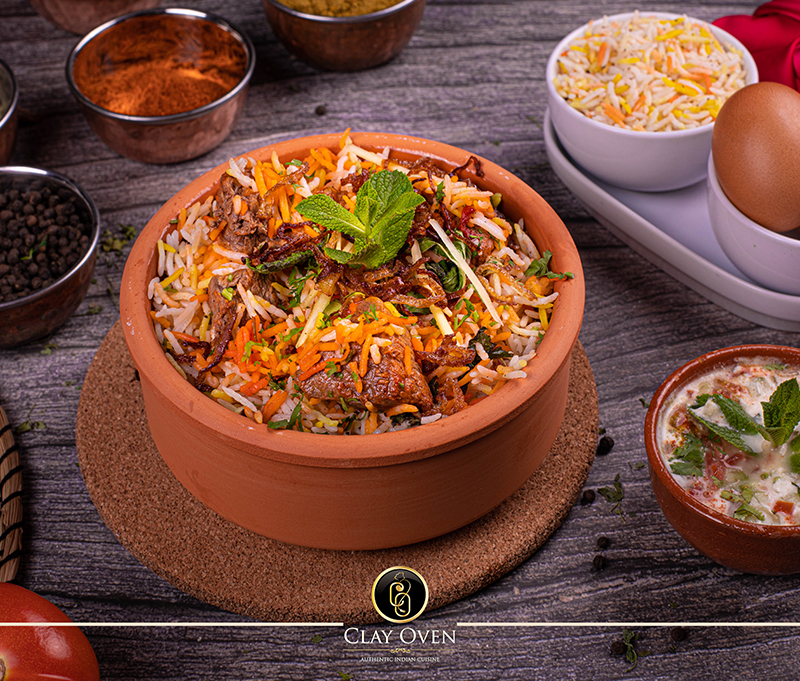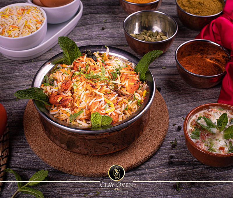 Chicken pieces and basmati rice cooked together with fragrant Indian spices and herbs, layered to perfection. This flavorful main course is garnished with crispy fried onions and fresh coriander, and served with a side of Raita.