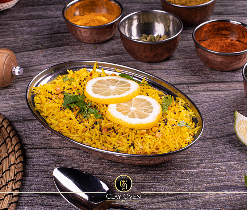 Tangy basmati rice sautéed with mustard seeds and turmeric, infused with fresh lemon juice. Garnished with fresh coriander. Riz basmati sauté avec des graines de moutarde et du curcuma, infusé de jus de citron frais. Garni de coriandre fraîche.