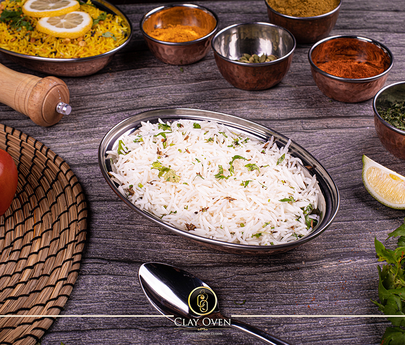 Basmati rice sautéed with aromatic cumin seeds. This simple yet flavorful rice is garnished with fresh coriander. Riz basmati sauté avec des graines de cumin aromatiques. Ce plat savoureux est garni de coriandre fraîche.