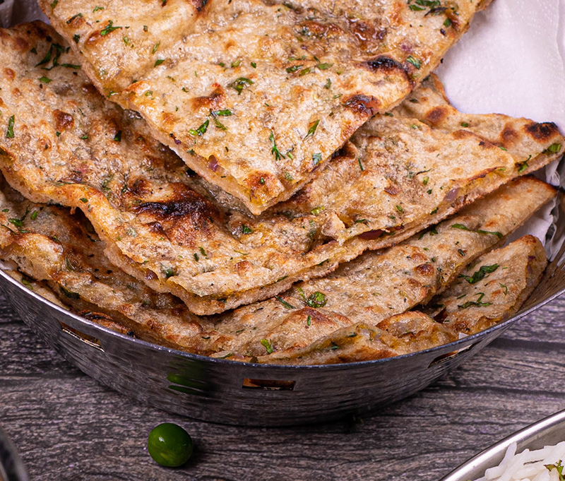 OIGNON FARCI- Soft, leavened flatbread made from maida flour, stuffed with seasoned onions and cooked to perfection in a traditional tandoor oven. Pain à base de farine de blé, farci d'oignons assaisonnés et cuit à la perfection dans un four traditionnel.
