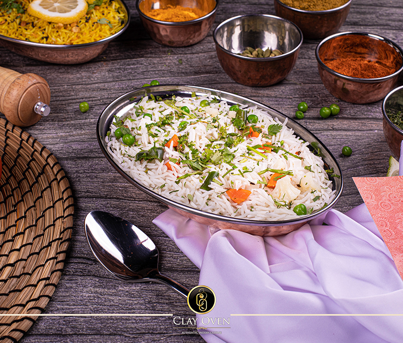 Fragrant basmati rice cooked with a medley of fresh vegetables, flavored with aromatic spices and herbs. This delightful vegetarian main course is garnished with fresh coriander.