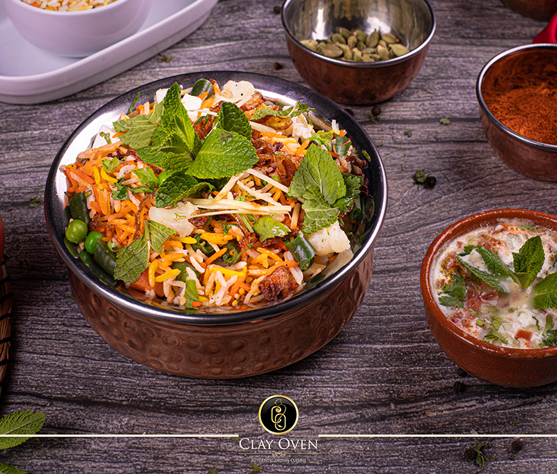 Aromatic basmati rice cooked with fresh vegetables and paneer, layered with fragrant Indian spices and herbs. This delightful vegetarian main course is garnished with crispy fried onions and fresh coriander, and served with a side of refreshing Raita.